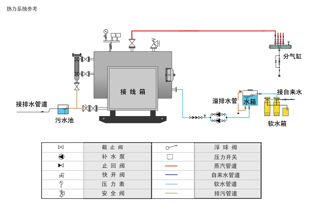 7、鍋內有汽(氣)水分界面的鍋爐應設置缺水保護裝置。當鍋爐水位低于缺水保護水位(或*限低水位)時,切斷電熱元件電源,發出報警信號,并應在人工復位后方可重新啟動運行。
